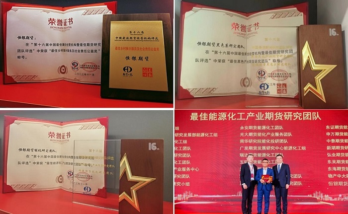 本屆評(píng)選于今年4月啟動(dòng),在歷時(shí)四個(gè)多月,經(jīng)過手機(jī)投票、專家評(píng)審等環(huán)節(jié),恒銀期貨最終榮獲“最佳能源化工產(chǎn)業(yè)期貨研究團(tuán)隊(duì)”、“最佳黑色產(chǎn)業(yè)期貨研究團(tuán)隊(duì)”以及“最佳鄉(xiāng)村振興服務(wù)及社會(huì)責(zé)任公益獎(jiǎng)”。