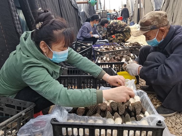 眼下正值羊肚菌豐產期,在北店頭鎮(zhèn)西同籠村的三十多個溫室大棚里,羊肚菌長勢喜人,村民們正在忙著收割、打包,一派忙碌景象。