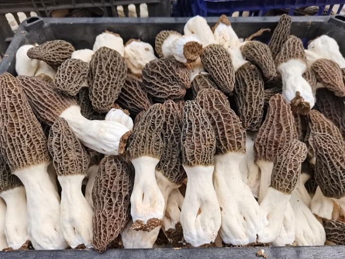 該基地占地25畝,初建有大棚27座。自去年11月播種以來,羊肚菌長勢良好,4月份已陸續(xù)開始出菇,種植戶們沉浸在羊肚菌收獲的喜悅之中,大棚內(nèi)一朵朵羊肚菌破土而出,乳白色的菌柄撐起蜂窩狀的菌蓋,煞是喜人。大家滿懷喜悅的采摘羊肚菌,去根、烘烤、挑選、打包,做著銷售前的準(zhǔn)備,一片繁忙歡快的景象。